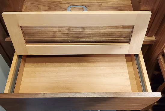 We most often use premium quality solid Spanish Cedar shelves and trim, and either Mahogany or Spanish Cedar veneered walls and ceiling panels.
